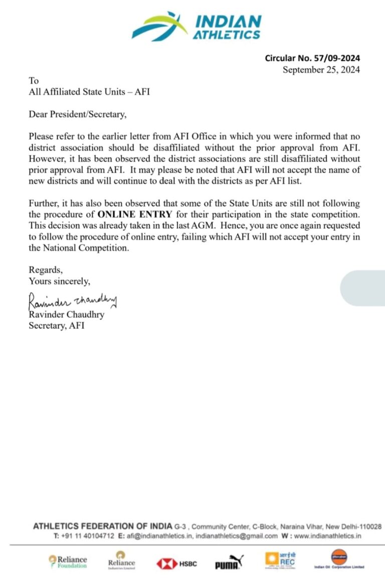 इस बारे में बुधवार को एएफआई के सचिव रविंदर चौधरी द्वारा जारी सर्कुलर संख्या 57/9-2024 के अनुसार एएफआई के पूर्व अनुमोदन के बिना किसी भी जिला संघ को असंबद्ध नहीं किया जाना चाहिए। हालाँकि यह देखा गया है कि जिला संघों को अभी भी एएफआई से पूर्व अनुमोदन के बिना असंबद्ध किया जाता है।सचिव रविंदर चौधरी ने सख्त शब्दों में कहा कि एएफआई नए जिलों के नाम को स्वीकार नहीं करेगा और एएफआई की लिस्ट के अनुसार जिलों के साथ कार्य करना जारी रखेगा।