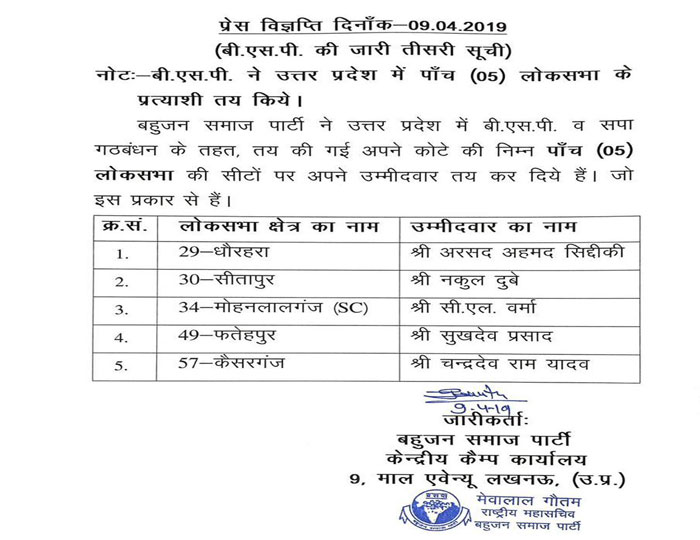 लोकसभा चुनाव 2019 के लिए बसपा ने मंगलवार को अपने प्रत्याशियों की तीसरी सूची जारी की. बता दें, सपा बसपा और राष्ट्रीय लोकदल के साथ महागठबंधन में बसपा के खाते में 38 सीट हैं। चौथे चरण के मतदान वाले क्षेत्र के इन पांच प्रत्याशियों ने अपना प्रचार अभियान पहले ही शुरू कर दिया था।