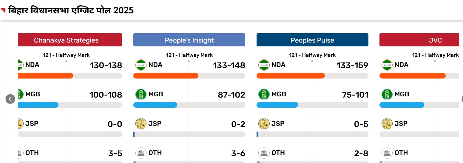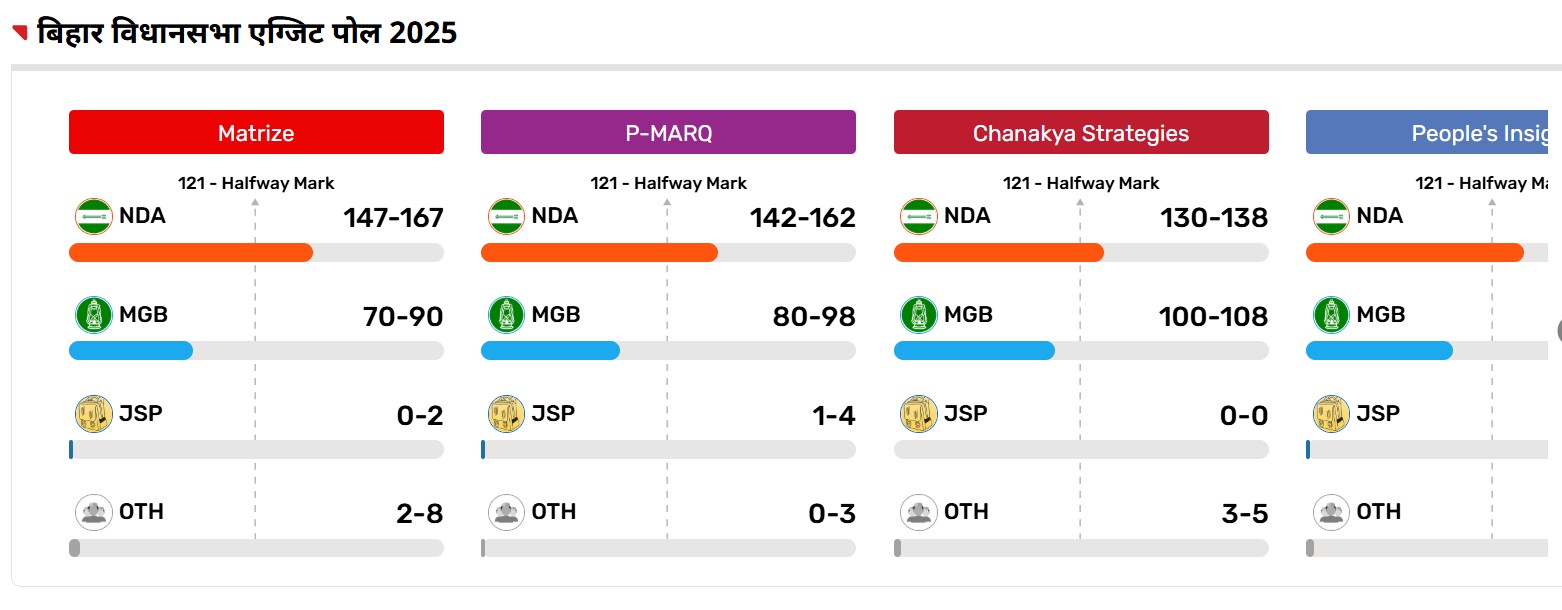 News18 मेगा एग्जिट पोल के अनुसार एनडीए को 130 से अधिक सीटें मिलने की संभावना जताई गई है। वहीं, Matrize ने एनडीए को 147-167 सीटें, और JVC ने 135-150 सीटों का अनुमान दिया है। People’s Insight और People’s Pulse के सर्वे में भी एनडीए को क्रमशः 133-148 और 133-159 सीटें मिलने की संभावना बताई गई है।