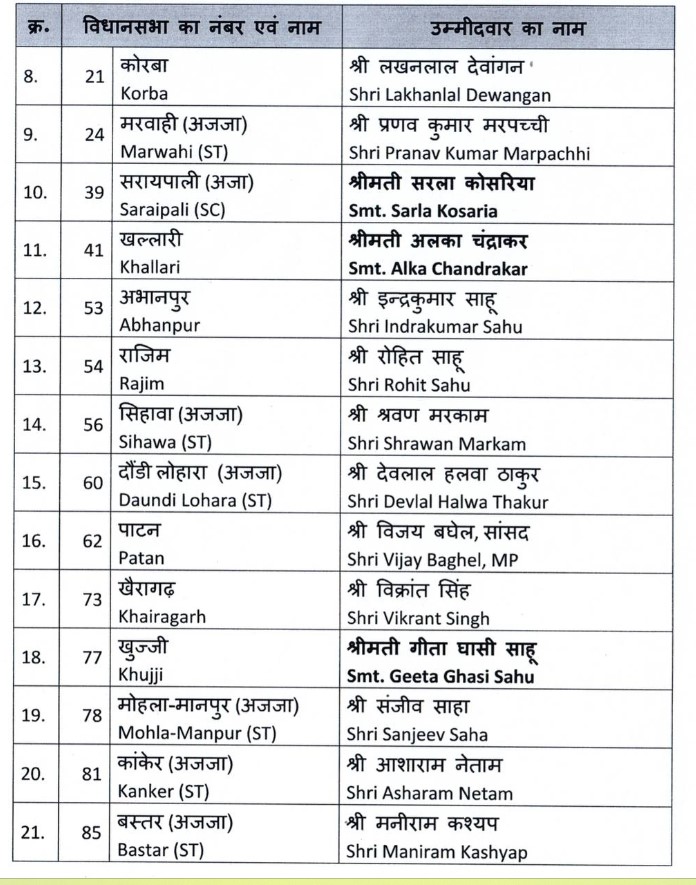 बीजेपी ने 90 सदस्यीय छत्तीसगढ़ विधानसभा के लिए 21 और मध्य प्रदेश के लिए 39 उम्मीदवारों का एलान गुरुवार को किया है जबकि मध्यप्रदेश में 230 सीटें हैं।