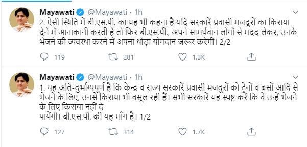 इससे पहले बसपा सुप्रीमो मायावती ने ट्वीट करके कहा कि यह अति-दुर्भाग्यपूर्ण है कि केन्द्र व राज्य सरकारें प्रवासी मजदूरों को ट्रेनों व बसों आदि से भेजने के लिए, उनसे किराया भी वसूल रही हैं। सभी सरकारें यह स्पष्ट करें कि वे उन्हें भेजने के लिए किराया नहीं दे पायेंगी। बसपा की यह माँग है।