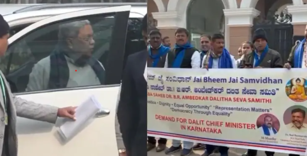 प्रदर्शन कर रहे लोगों ने नारेबाजी की और पोस्टर लहराए, जिनमें राज्य में दलित नेतृत्व को आगे लाने की बात लिखी थी।