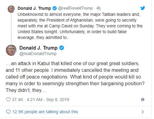 अमेरिकी राष्ट्रपति डोनाल्ड ट्रंप ने अफगानिस्तान और तालिबान नेताओं के साथ चल रही शांति वार्ता को रद्द कर दिया है। उन्होंने ये फैसला काबुल में हुए कार बम धमाके के बाद लिया है, इस धमाके में एक अमरीकी सैनिक सहित कुल 12 लोगों की मौत हो गई थी। इस हमले की जिम्मेदारी तालिबान ने ली थी।