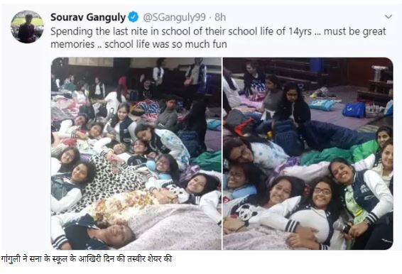 पूर्व कप्तान सौरभ गांगुली ने इस ट्वीट को अपना पिन ट्वीट भी बनाया है। इसके साथ ही उन्होंने सना के स्कूल के आखिरी दिन की तस्वीर शेयर करते हुए लिखा कि 14 साल के स्कूल लाइफ का आज आखिरी दिन है।