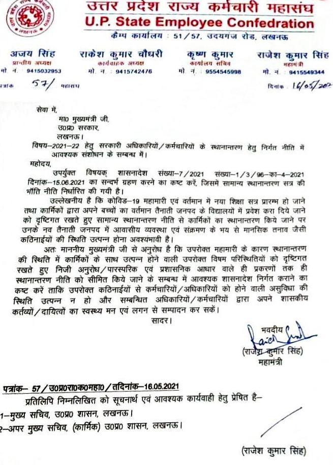 इस संबंध में राज्य कर्मचारी संयुक्त परिषद  ने मुख्यमंत्री को पत्र भेजकर प्रदेश के कर्मचारियों के लिए आगामी सामान्य स्थानान्तरण सत्र 2021-2022 को शून्य घोषित करने की मांग की है ताकि कोरोना संक्रमण से निपटने में बाधा उत्पन्न न हो। सरकार के इस निर्णय से पैसों की बचत होगी और कर्मचारियों में विश्वास के साथ कार्य करने की क्षमता में बढ़ोतरी भी होगी।