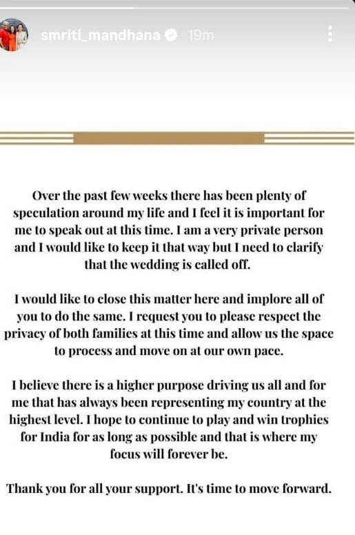 मंधाना ने लिखा पिछले कुछ हफ्तों से मेरे जीवन को लेकर कई अटकलें लग रही थीं। मैं बेहद निजी व्यक्ति हूं, लेकिन अब यह स्पष्ट करना आवश्यक है कि शादी रद्द कर दी गई है। मैं चाहती हूं कि यह मामला यहीं समाप्त हो जाए। कृपया दोनों परिवारों की गोपनीयता का सम्मान करें और हमें इस परिस्थिति से उबरने का समय दें।”
