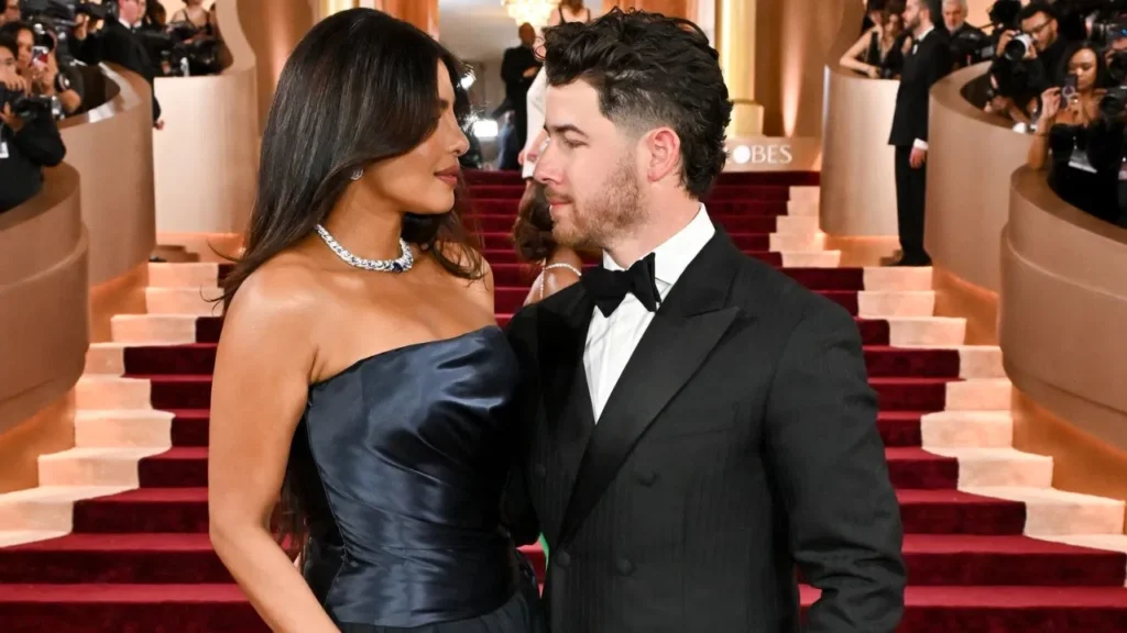 वहीं निक जोनस ब्लैक टक्सिडो में बेहद डैशिंग दिखे। रेड कार्पेट पर दोनों के बीच क्यूट मोमेंट्स भी कैमरे में कैद हुए—कभी प्रियंका निक का बो ठीक करती दिखीं तो कभी निक, प्रियंका के बालों को संवारते नजर आए।