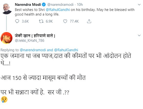 वहीं एक ट्विटर यूजर ‘जेकी खान [ हरियाणे वाले ]’ ने लिखा कि, एक जमाना था जब प्याज,दाल की कीमतों पर भी आंदोलन होते थे….! आज 150 से ज्यादा मासूम बच्चों की मौत पर भी सन्नाटा क्यों है. सर जी .??