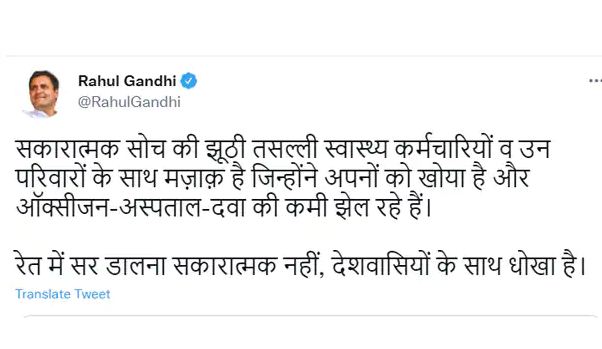 वहीं राहुल गांधी ने भी सरकार पर तंज किया है। उन्होंने इस दौरान इस खबर की एक मीडिया रिपोर्ट साझा कर ट्वीट करते हुए कहा कि सकारात्मक सोच की झूठी तसल्ली स्वास्थ्य कर्मचारियों व उन परिवारों के साथ मज़ाक़ है जिन्होंने अपनों को खोया है और ऑक्सीजन-अस्पताल-दवा की कमी झेल रहे हैं. बकौल राहुल गांधी, रेत में सर डालना सकारात्मक नहीं, देशवासियों के साथ धोखा है।