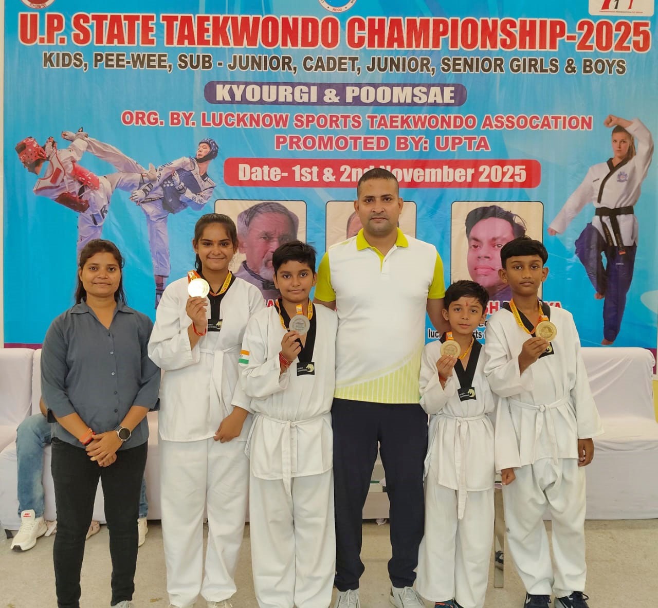 लखनऊ। विश्वनाथ एकेडमी आशियाना के विद्यार्थियों ने लखनऊ के महाराजा अग्रसेन शिक्षण संस्थान मोतीनगर में 1 व 2 नवंबर, 2025 को आयोजित यूपी राज्य ताइक्वांडो प्रतियोगिता में 3 स्वर्ण, 1 रजत सहित 4 पदक अपने नाम करते हुए लखनऊ का परचम लहराया।