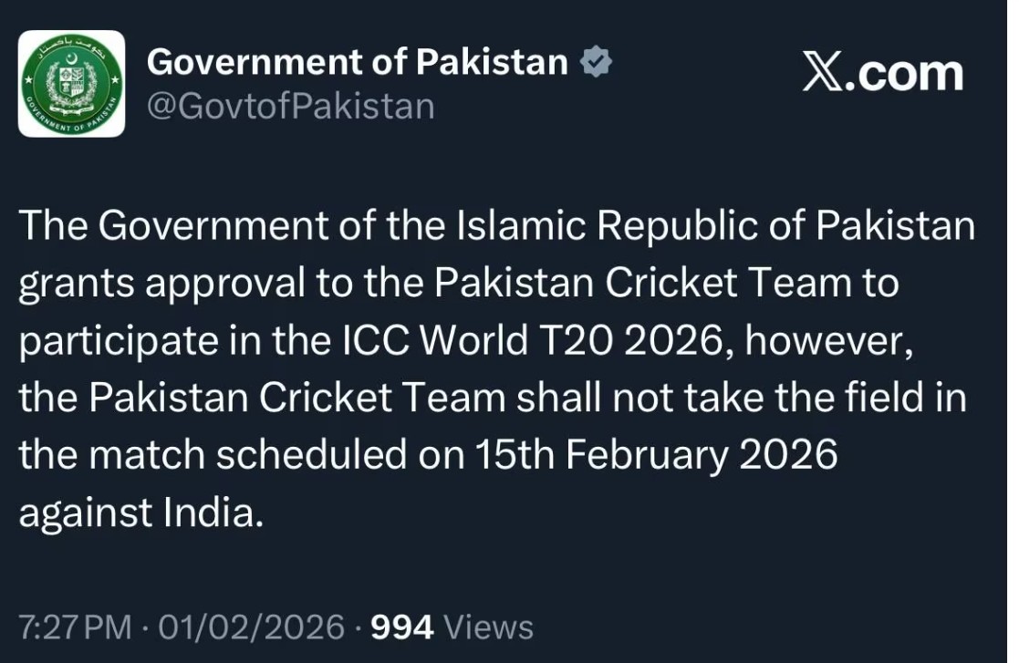 रविवार को सोशल मीडिया प्लेटफॉर्म एक्स (पूर्व ट्विटर) पर जारी एक आधिकारिक बयान में पाकिस्तान सरकार ने कहा, “इस्लामिक रिपब्लिक ऑफ पाकिस्तान की सरकार पाकिस्तान क्रिकेट टीम को आईसीसी वर्ल्ड टी20 2026 में भाग लेने की अनुमति देती है। हालांकि, पाकिस्तान क्रिकेट टीम 15 फरवरी 2026 को भारत के खिलाफ निर्धारित मैच में हिस्सा नहीं लेगी।”