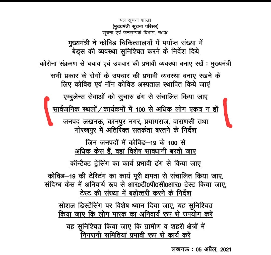 इसके साथ ही योगी सरकार ने कोरोना प्रोटोकॉल का सख्ती से अनुपालन करवाने के निर्देश दिए गए हैं। इसके आलावा कोरोना प्रोटोकॉल का उल्लंघन करने वालों के खिलाफ सख्त एक्शन लेने के लिए कहा है।