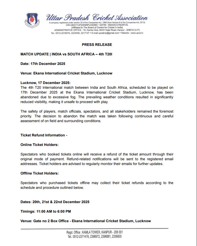 लखनऊ। लखनऊ के इकाना इंटरनेशनल क्रिकेट स्टेडियम में 17 दिसंबर को प्रस्तावित भारत और दक्षिण अफ्रीका के बीच चौथा टी-20 अंतरराष्ट्रीय मुकाबला घने कोहरे के कारण रद्द कर दिया गया। खराब मौसम की वजह से मैदान पर दृश्यता बेहद कम हो गई थी, जिससे खेल कराना सुरक्षित नहीं रह गया।