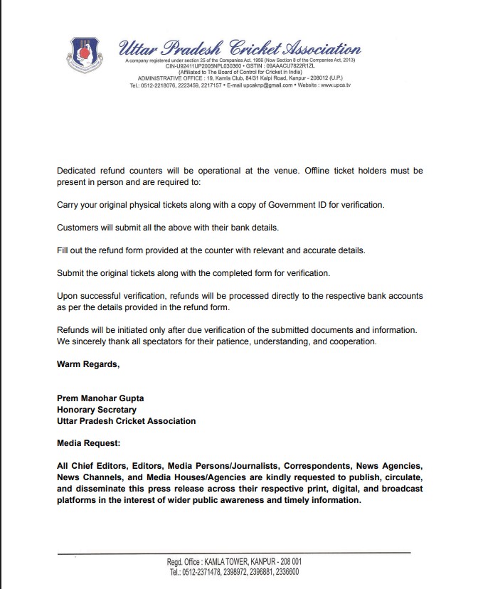 स्थान: गेट नंबर-2, बॉक्स ऑफिस, इकाना इंटरनेशनल क्रिकेट स्टेडियम, लखनऊ