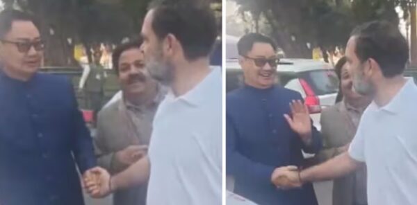 लोकसभा में नेता विपक्ष राहुल गांधी और संसदीय कार्य मंत्री किरेन रिजिजू का एक वीडियो सामने आया है, जिसमें दोनों नेता मुस्कुराते हुए बातचीत करते और हाथ मिलाते दिखाई दे रहे हैं।