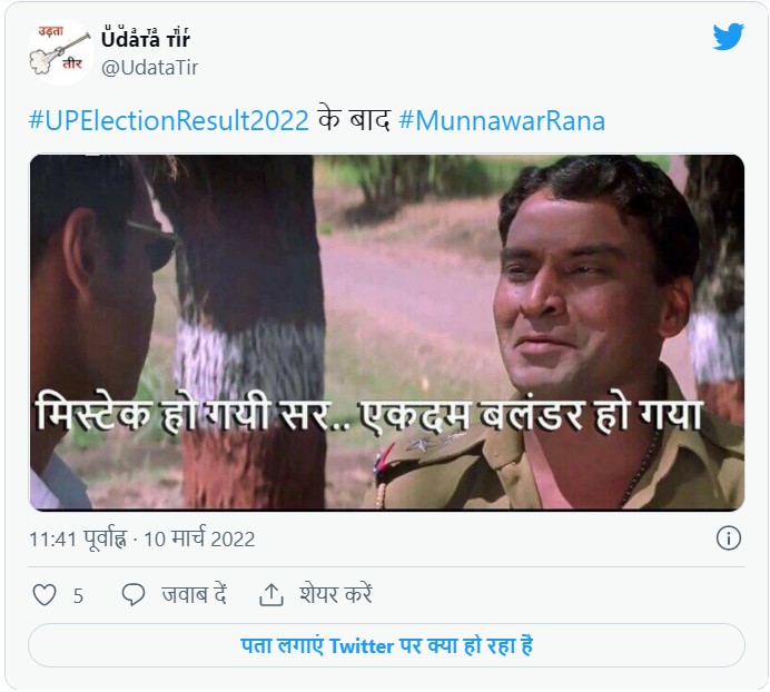 ऐसे में शायर मुनव्वर राणा का पुराना बयान एकाएक सोशल मीडिया पर वायरल हो गया है। इस वजह से सोशल मीडिया पर मुनव्वर राणा ट्रोल होने लगे हैं। सोशल मीडिया पर अब यूजर्स मुनव्वर राणा की खूब मौज ले रहे हैं और ट्विटर पर मीम की भरमार देखने को मिल रही है।