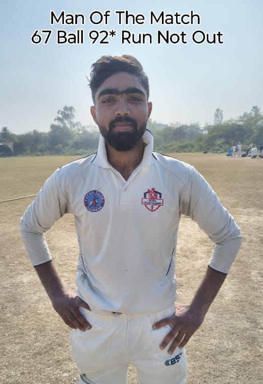 सलामी बल्लेबाज जीशान खान ने 67 गेंदों पर 14 तूफानी चौकों की सहायता से नाबाद 92 रन की पारी खेलते हुए टीम को जीत दिलाई। कंचन स्पोर्टस क्रिकेट क्लब से शिवा राजपूत ने दो विकेट चटकाए।
